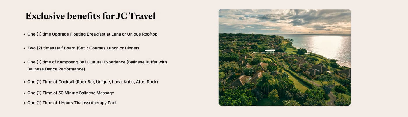 • Stay is bed and breakfast including all benefits ONLY AVAILABLE TO JC TRAVEL CLIENT